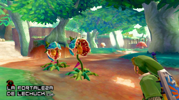 En cuánto al sonido, se ha hecho un gran trabajo y se ha intentado llegar a las grandes melodías de la saga con ayuda de algunos temas orquestados, aunque también se recuperan directamente algunos clásicos. El tema principal es realmente sublime (¿quién iba a pensar que el Zelda’s lullaby iba a sonar tan bien del revés?), pero también hay algunos que adornan la ambientación sin más, pero que no perdurarán en nuestra memoria. Las melodías que tocamos ( o más bien, acompañamos) con el instrumento principal, la Lira (un pequeño arpa portable), son buenas, pero no alcanza el nivel que tenían éstas en Ocarina of Time ni de lejos. En general es un apartado que siempre ha sido muy cuidado en la saga y se nota, siguen siendo el estandarte la técnica de cambiar la melodía según en que situaciones de forma dinámica creando emoción en el usuario (la melodía que suena en el templo del desierto cuando le damos vida a las zonas es digna a destacar como cambia el tono de desolación a la vida)