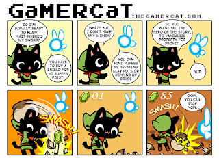 Esta es la leche. La obsesión por el dinero es locura, y el buscar rupias en todo yerbajo o jarrón que veas es, a veces, obsesivo. Link-cat se vuelve loco una vez comienza aconsejado por Navi.