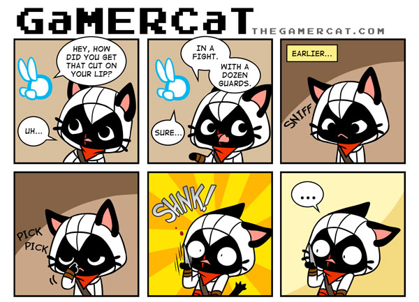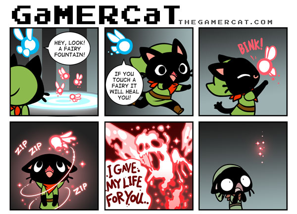 No solo los juegos más recientes son protagonistas, no puede faltar Assassin’s Creed, que nos reporta muchas peculiaridades que son transformadas en miles de parodias. The Gamercat también se apunta una de ellas, e incluso Navi de Zelda Ocarina of Time, se encuentra con Altair como pedro por su casa.Continuamos con las dedicadas a The Legend of Zelda, ya que a parte del cameo de Navi en la anterior, Link es protagonista de algunas otras, como esta, ¿Nunca te has puesto en el lado de esas hadas que estaban tan tranquilas en un jarrón y dan tu vida por ti?