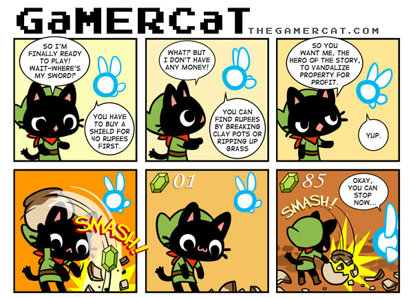 Esta es la leche. La obsesión por el dinero es locura, y el buscar rupias en todo yerbajo o jarrón que veas es, a veces, obsesivo. Link-cat se vuelve loco una vez comienza aconsejado por Navi.