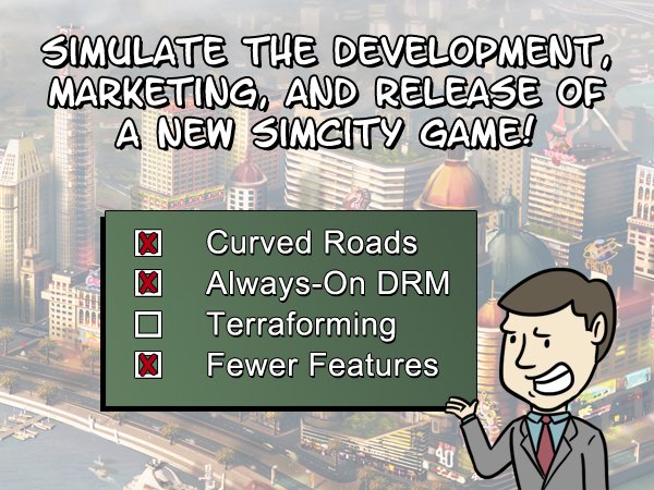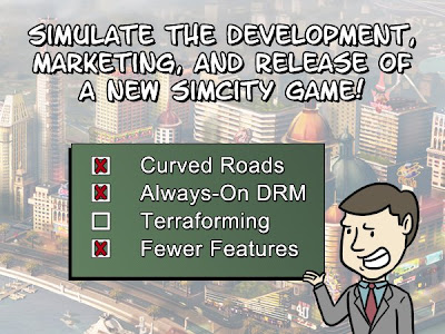 | Simula el desarrollo, marketing y el lanzamiento de un nuevo SimCity! (carreteras con curvas, siempre con conexión a internet, modificación del terreno, menos funciones) |