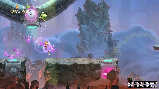 El nivel que pudimos probar era musical. Esta vez controlé en dos turnos tanto al «bicho volador» con la táctil del Wii U Gamepad, como a Rayman con el Wii U Pro Controller. Jugar con alguien a un plataformas y con dos sistemas de control diferentes era bastante gracioso, está muy bien implementado. Al ritmo de la música uno iba tocando en la táctil varios objetos y enemigos que surgían por el escenario, repercutiendo en ciertas cosas al jugador que controlaba a Rayman. En esta pantalla el scroll horizontal te barría así que era de correr y saltar a lo loco y al ritmo de la música. Wally y yo nos pegamos unas buenas risas con nuestra torpeza musical. Está claro que el modo dos jugadores es muy al estilo «Super Mario Galaxy«, y aunque no se haya anunciado todavía, apuesto a que tendrá un modo de un jugador sin ningún problema al estilo del gran Rayman Origins.