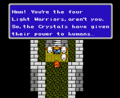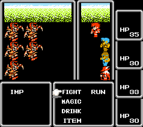 En FF I se nos presentaba un sistema de batalla por turnos, con un menú de acciones: atacar, magia, objeto y huir. Al comienzo del juego se eleguían entre 4 profesiones: guerrero, ladrón, mago negro, mago blanco, mago rojo y monje.