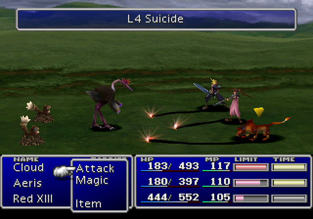 Final Fantasy VII marcó un antes y un después en la saga. Las numerosas horas de juego, los personajes carismáticos y una de las muertes más trágicas de la historia de los videojuegos, son sus señas características. Además FF VII pasó a tener 3 personajes en batalla e introdujo el uso de las materias, unos elementos con forma esférica que se usaban en las ranuras de los accesorios y las armas y se podían combinar entre sí para obtener más poder. Final Fantasy VII supuso un éxito sin precedentes, y el favorito de muchos fans.