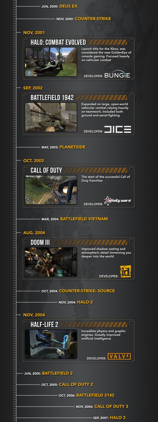 Uno de los géneros con más seguidores es sin duda los FPS (First Person Shooter, o juegos de tiros en primera persona), más conocido a día de hoy simplemente como Shooter. Los lanzamientos más importantes últimamente, y que más ventas cosechan, pertenecen a este género, y un claro ejemplo son los infinitos títulos de la serie Call of Duty o Halo, aunque es muy cuestionable su calidad en comparación con los clásicos.