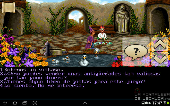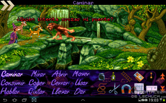 A lo largo de esta aventura nos reuniremos con personajes muy variopintos: cabras que hablan con un Troll que bloquea un puente, un gigante dormido, dragones, brujas, y otros seres que conforman este gran universo de fantasía lleno de referencias en clave de humor a clásicos de la literatura como El Señor de los Anillos, Las Crónicas de Narnia, Las habichuelas mágicas, entre otras. El humor y los puzzles absurdos hicieron de este juego todo un referente, no obstante los enrevesados rompecabezas rozaban a veces nuestra desesperación. No quiero mentiros, al menos para mí fue un juego difícil. Muchas veces tuve que tirar de guía desesperada porque mi hermano y yo no dábamos con la solución después de días atascados. En esta adaptación para tablets y smartphones, como viene siendo costumbre, disponemos de un interrogante en la parte superior derecha para hacernos las cosas más fáciles.