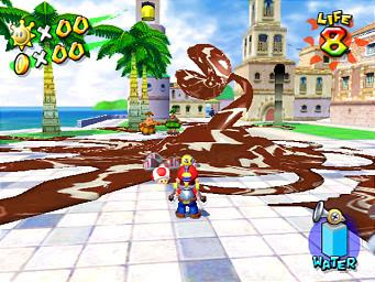 En esta ocasión se le da al jugador la oportunidad de llevar a Mario, en una vista en tercera persona y con una cámara un poco más libre y fácil de controlar con el stick C, además sus habilidades serán muy parecidas a als ya vistas pero se añadirá algo más. Además de los saltos típicos de Mario contaremos con una ayuda proveniente del mismisimo Profesor Fesor (el científico que ayuda a Luigi en su Mansión), tendremos una mochila llamada ACUAC, que escupirá agua de diferentes formas, en momentos lo usaremos a modo de jetpack y en otros de reactor para pegar grandes saltos.